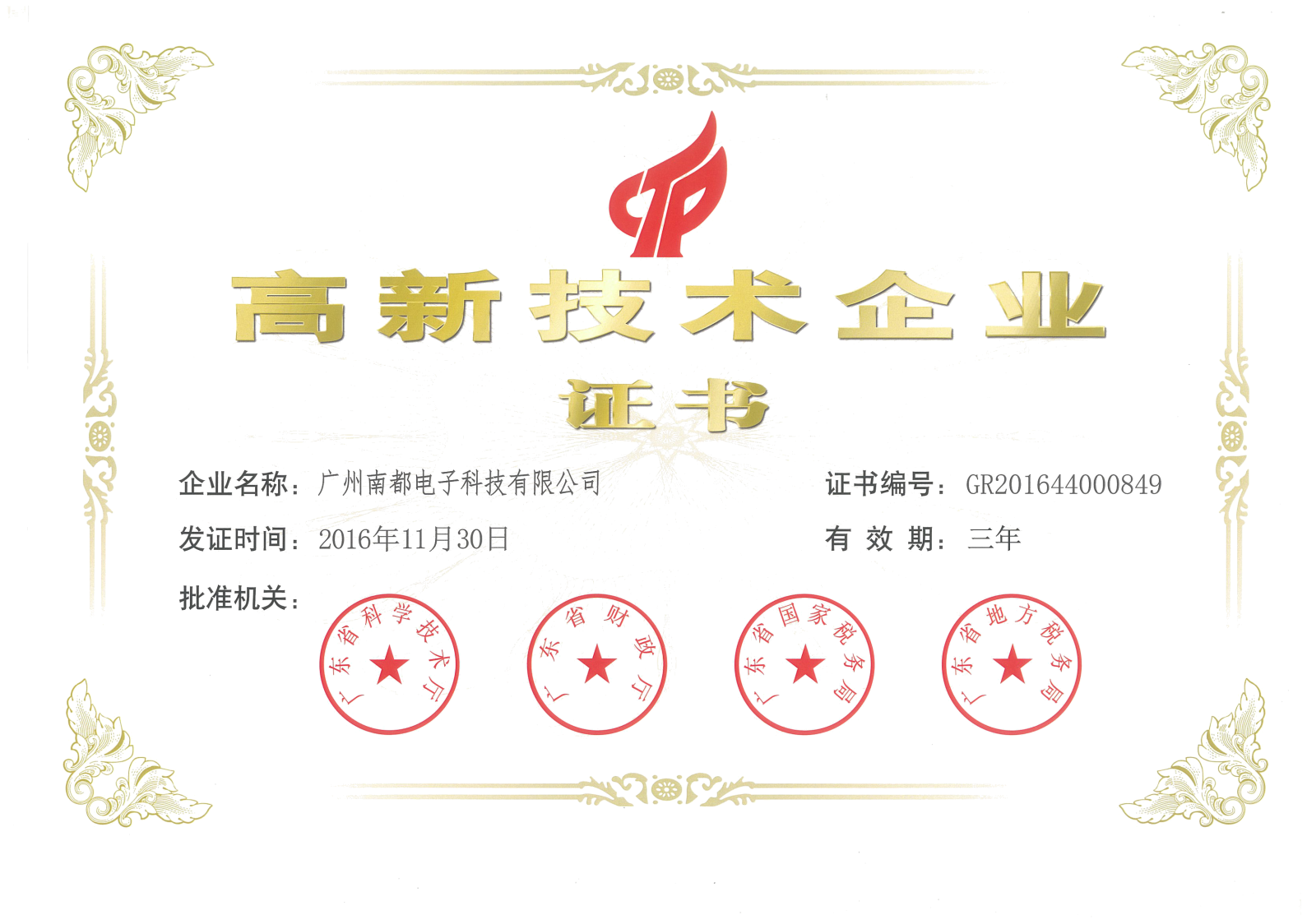 依据《高新技术企业认定管理办法》(国科发火〔2016〕32号)、《高新技术企业认定管理工作指引》(国科发火〔2016〕195号)有关规定,经企业申报、专家评审、认定机构审核。广州南都电子科技有限公司经过严格的层层审核,顺利通过高新技术企业认定。