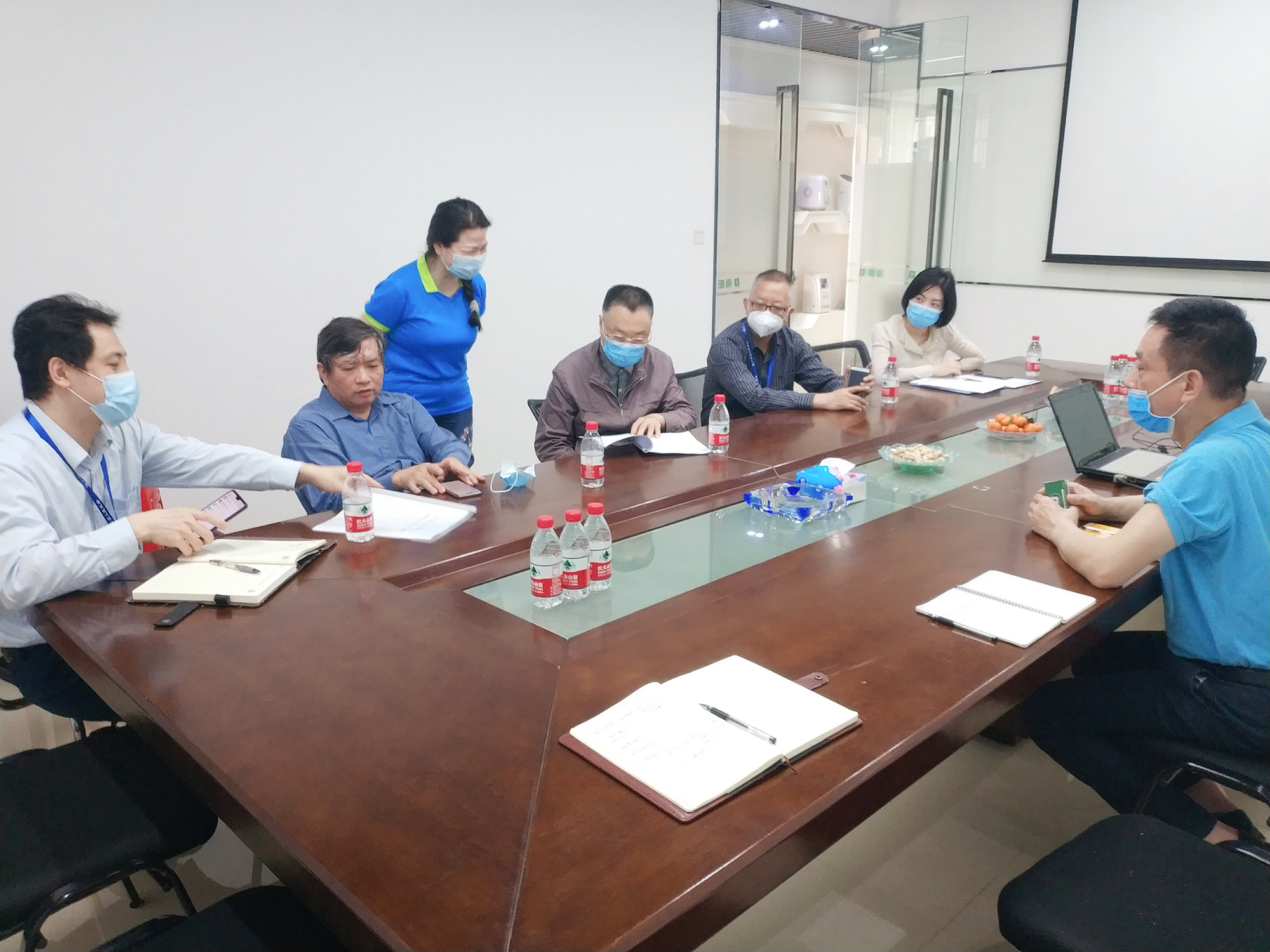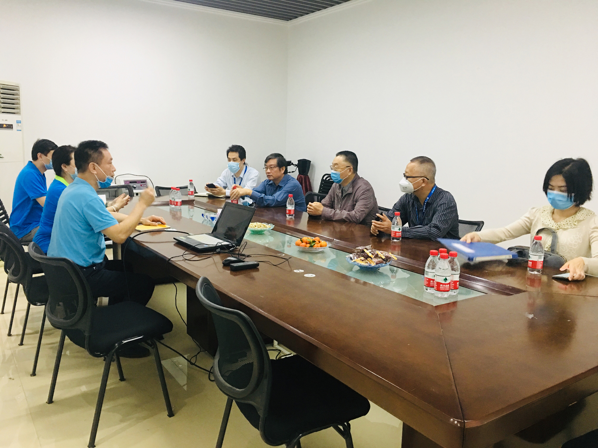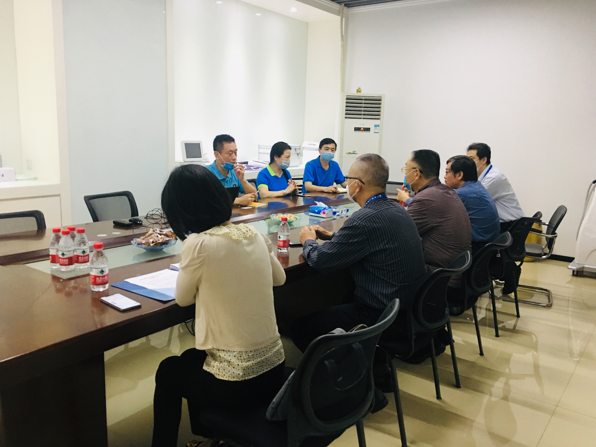 随后,朱总与市局、区局领导在会议室进行关于公司状况的交流。朱总向市局、区局领导介绍了公司的发展方向,及在实际生产、复工、市场等方面的情况,得到了市局、区局领导的一致认可和赞许,对公司的进一步发展壮大提供了宝贵支持与帮助,感谢市局、区局领导对于公司的关心与支持。